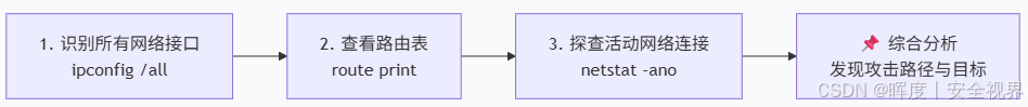网络信息收集遵循:从接口到路由,再到活动连接的逻辑顺序,以全面掌握目标的网络态势: