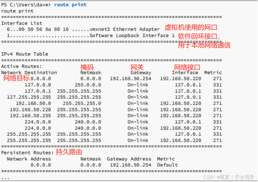 | 127.0.0.0 | 255.0.0.0 | On-link | 127.0.0.1 | 331 | 回环地址路由:用于本机内部进程间通信。 |