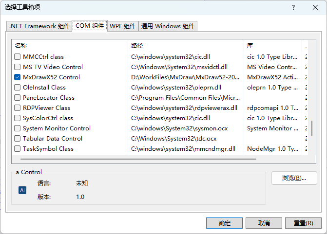 二、Visual Studio 中的 COM中选择 (MxDrawX52.Control)点击确定