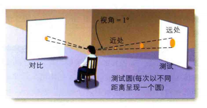 在Holway和Boring(1941)的实验中,被试坐在两走廊的交叉口,需要观察右侧走廊里的一个发光的测试圆,同时也需要观察左侧走廊里的一个发光的对比圆。对比圆与被试的距离始终是3米,而测试圆的距离在3~36米变化。固定位置的对比圆的大小可以调节,被试的任务是调节对比圆的直径,以匹配对测试圆的大小的知觉(而非测试圆的视角),如图3。