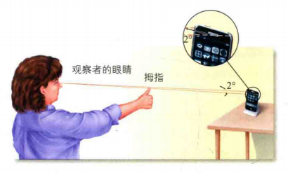 "拇指技术"是粗略测量视角的一个方法。伸直手臂注视拇指,处于手臂长度位置的手指宽度约为2°视角。因此被拇指刚刚好能遮挡的客体的视角约为2°。如图2所示,当母子刚刚好能把手机遮住时,手机的视角也为2°。这也说明了视角与距离有关,调整客体的距离过后,近处的小物体(如手指)的和远处的大物体(如手机)可以具有相同的视角。