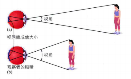 视角指物体在人眼视网膜的角度。眼球有360°,因此1°视角的物体只占其1/360,在成人眼睛里1°视角约为0.3毫米。视角与刺激的大小有关,刺激越大,视角越大,反之则越小。如图1所示,视角还取决于刺激与观察者间的距离,对于相同大小的刺激,当刺激越近时,视角变大,反之则越小。