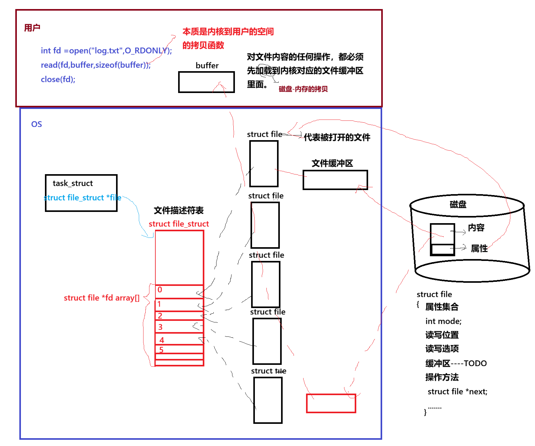 一个文件要被操作系统管理,需要先加载到内存,并且有描述他的结构体struct file(里面存放文件的状态和各种属性)。
