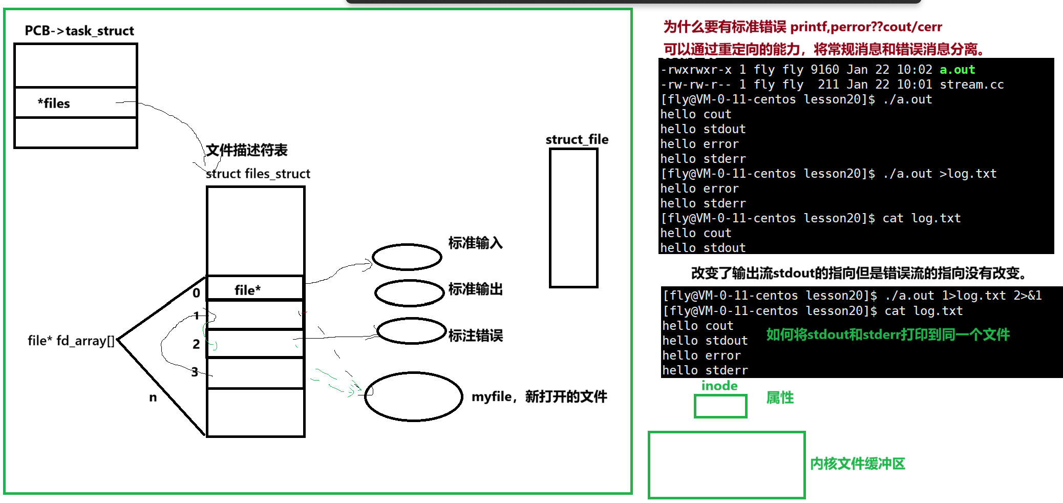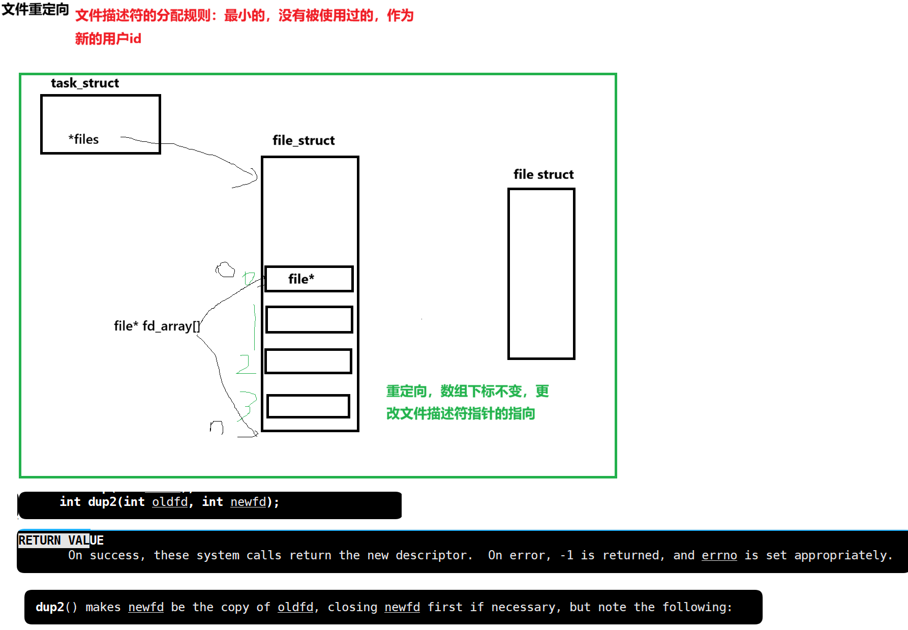 每个文件描述符都是一个内核中文件描述信息数组的下标,对应有一个文件的描述信息用于操作文件,而重定向就是在不改变所操作的文件描述符的情况下,通过改变描述符对应的文件描述信息进而实现改变所操作的文件