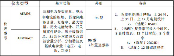 AEM96碳结算三相多功能电能表,定位于企业能碳管理系统中的数据采集与碳核算前端。针对电力系统,工矿企业,公用设施的电能统计、管理需求而设计的智能电能表,设备在完成常规三相电参数和电能计量的同时,可依据预设的碳排放系数,对电能消耗进行碳排放量换算,从源头上实现碳数据的生成。提供上 24 时、上 31 日以及上 12 月的电能数据统计。具有 31 次分次谐波与总谐波含量检测,带有开关量输入和继电器输出可实现"遥信"和"遥控"功能,并具备报警输出,可广泛应用于多种控制系统,SCADA 系统和能源管理系统中。