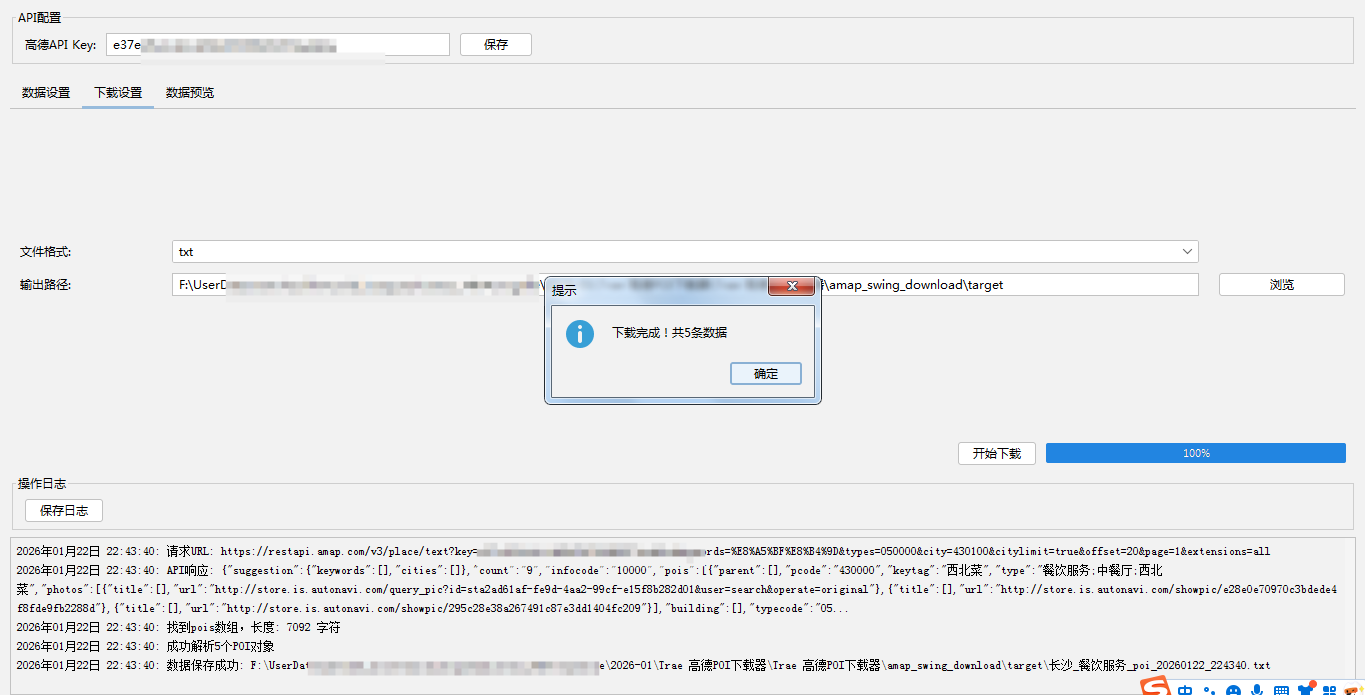 当我们设置好在线地图的APIKey,同时选择好相应的请求参数和下载参数后。接下来就可以点击下载按钮进行数据的下载。点击下载后,同时可以看到页面的进度条在进行滚动刷新。当数据下载完成后,回弹出提示窗口,如下图所示: