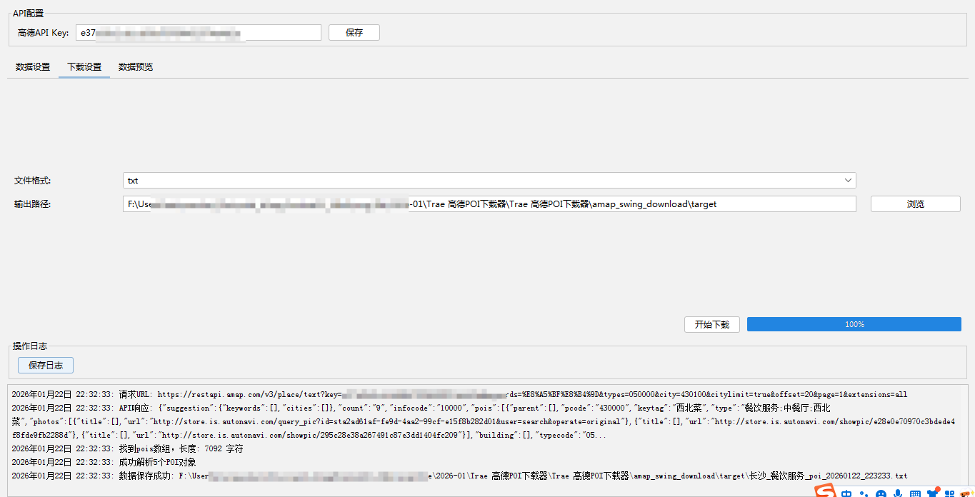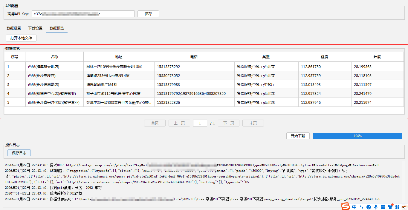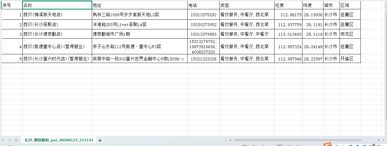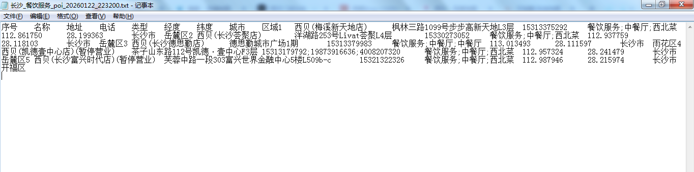 长沙作为湖南省的省会城市,地域广阔,交通繁忙,如何快速准确地找到西贝莜面村的门店?而随着科技的飞速发展,在线地图的应用为我们提供了极大的便利。通过在线地图,我们可以轻松地查看城市的各个角落,获取详细的地理位置信息和交通路线。这不仅节省了我们的时间和精力,还让我们能够更加便捷地探索城市的美食地图。本文将介绍使用在线地图和一个自己编写的在线地图工具来动态获取一个城市的门店信息地址,通过将结果输出为txt和cvs等不同的格式,为实现多源的数据输出创造了可能。如果大家对此有兴趣,可以来本文看看。
