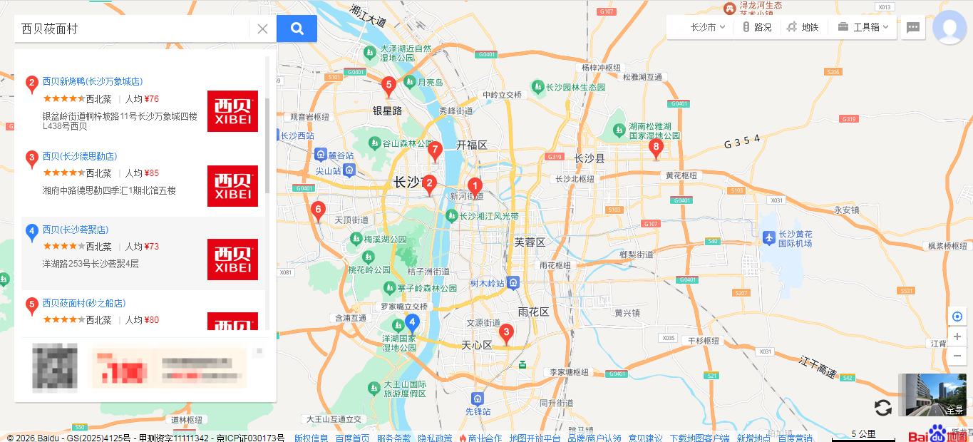 通过这个表格其实可以比较直观的看到,在湖南省长沙市中。目前还有5家西贝的门店,而位于茶子山东路112号凯德·壹中心F3层的西贝(凯德壹中心店)和位于芙蓉中路一段303富兴世界金融中心5楼L509b-c的西贝(长沙富兴时代店)均已暂停营业。到目前能看到只剩下三家门店营业。分别是雨花区的西贝(长沙德思勤店)和岳麓区的西贝(长沙荟聚店)及西贝(梅溪新天地店)。