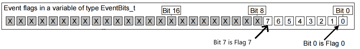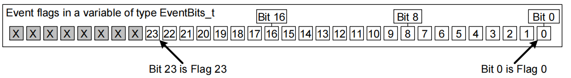 configUSE_16_BIT_TICKS定义为0,那么变量uxEventBits就是32位的, 其中有24个位用来存储事件组