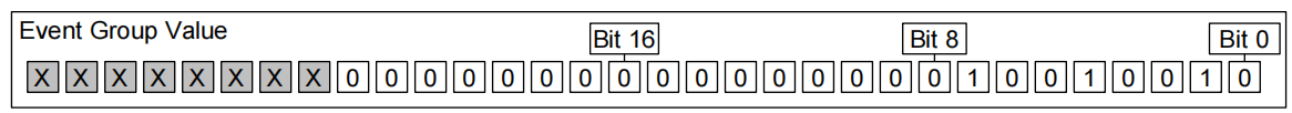 例如,如果一个事件组的值是0x92(二进制1001 0010),那么只有事件位1、4和7被设置,因此只有由1、4和7表示的事件发生。下图显示了EventBits_t类型的变量,它设置了事件位1、4和7,并清除了所有其他事件位,使事件组的值为0x92。