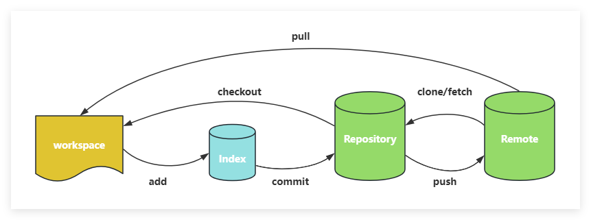 上图展示了 Git 四个核心区域(工作区、暂存区、本地仓库、远程仓库)之间的数据流转关系,箭头和动作对应 Git 命令: