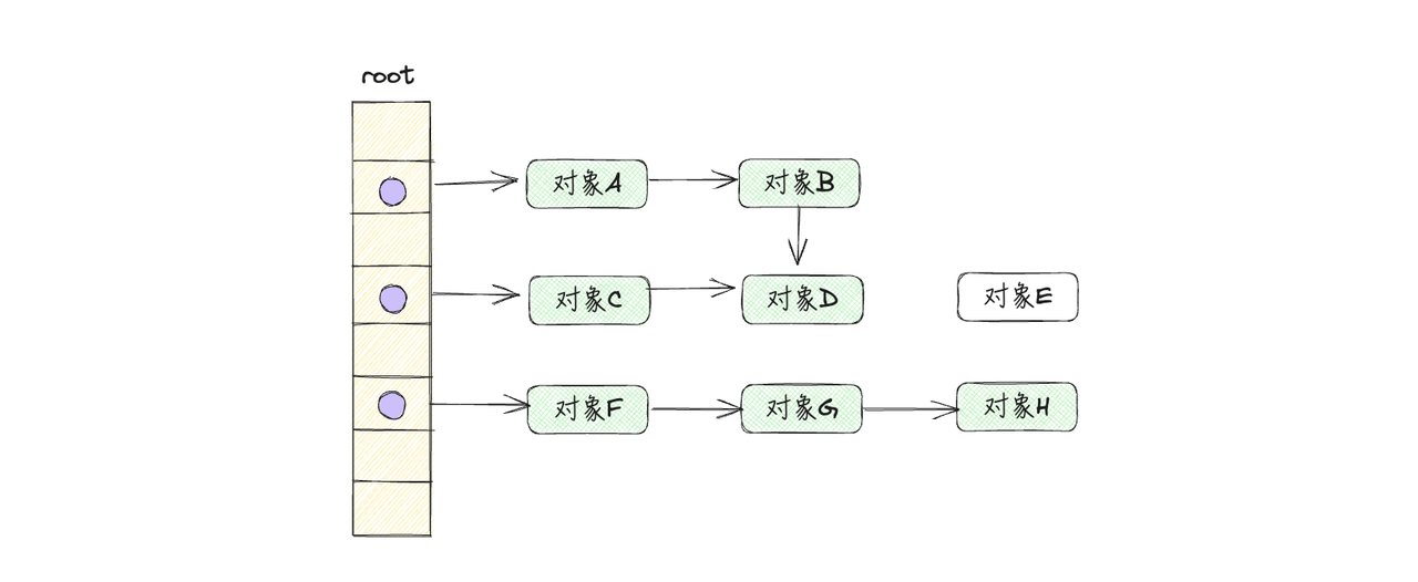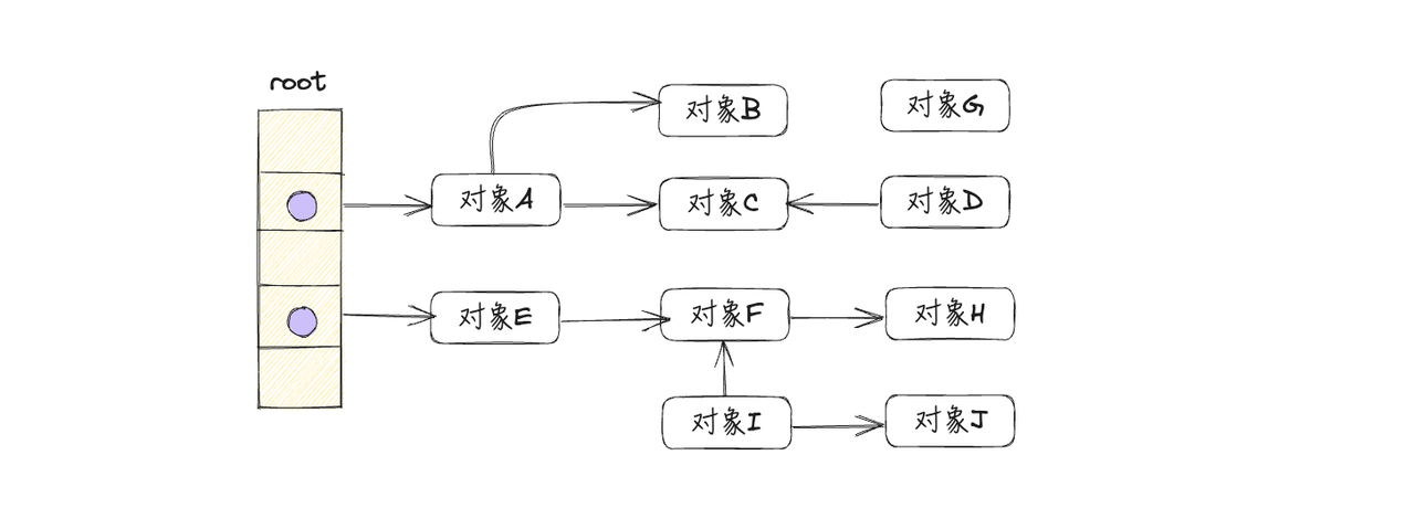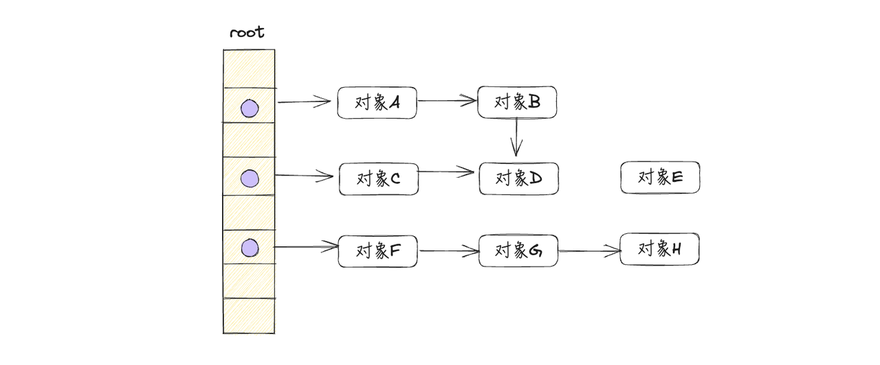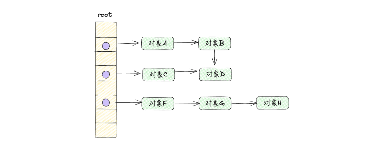 如上图所示,红色1标示的堆内存块就是垃圾内存,需要被回收清理,因为这块内存已经被分配,但是并没被使用,而剩下的两个黑色1标示的堆内存块不能被gc回收,因为还有两个栈上对象指向他们,它们还处于被引用状态中,处于使用阶段,不是垃圾内存