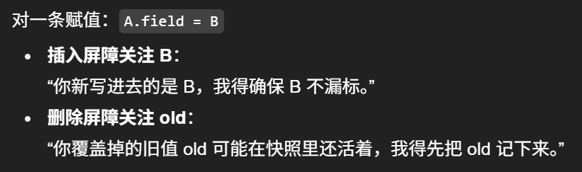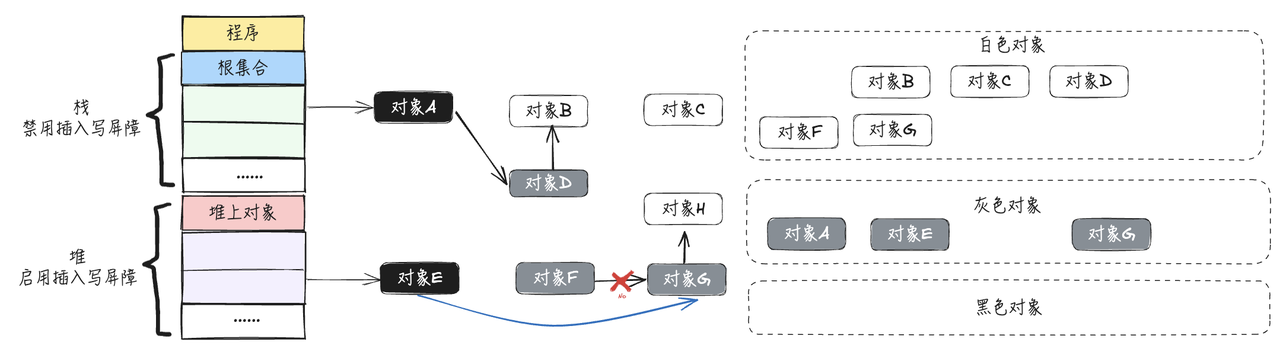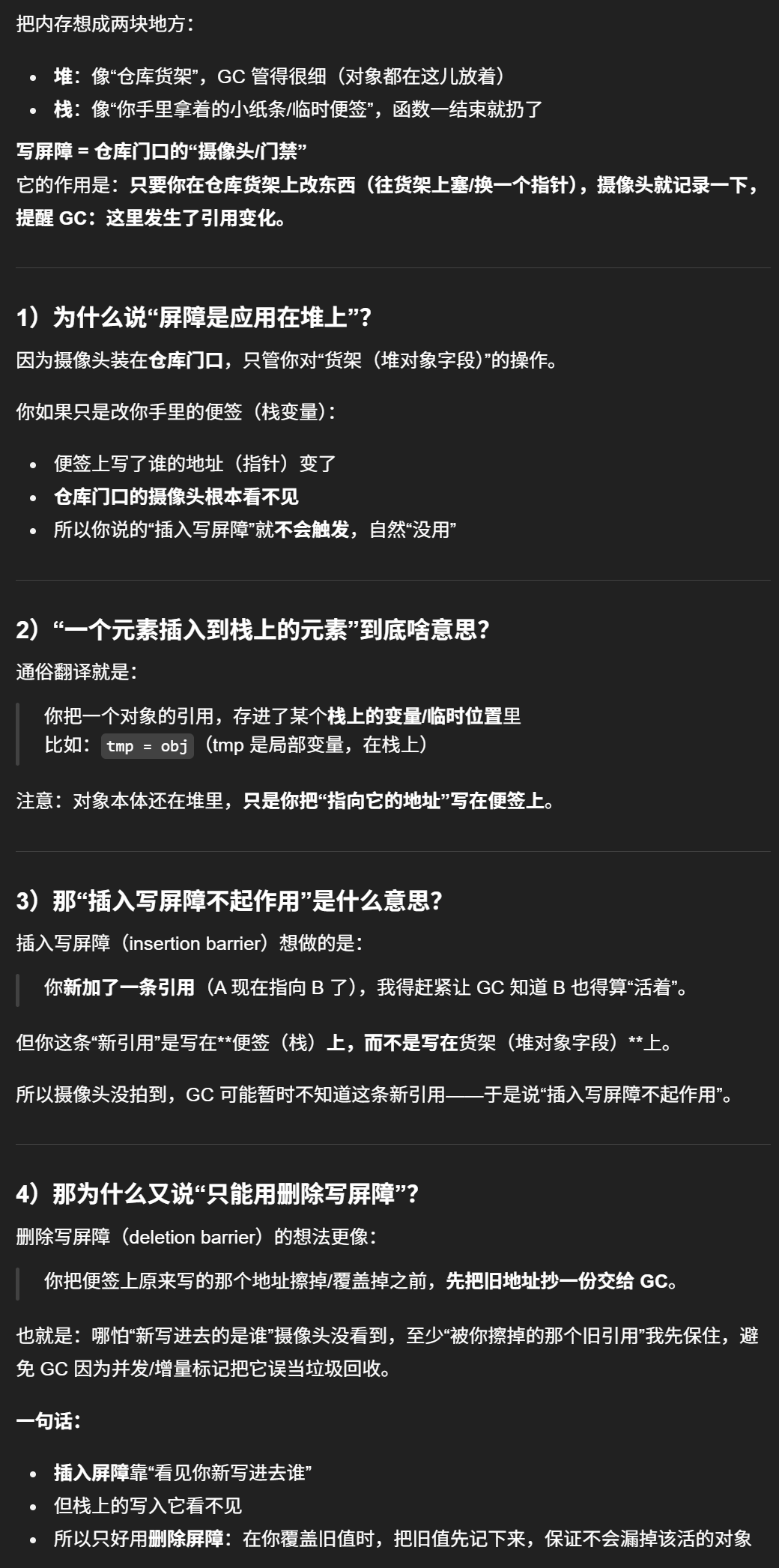 插入写屏障: 回收员给你立了个规矩:"如果你要把一个白色的玩具,放进一个黑色的玩具箱(都在地板上/堆上),你必须先主动把这个白色玩具涂成灰色。" 这样回收员就不会错过它。