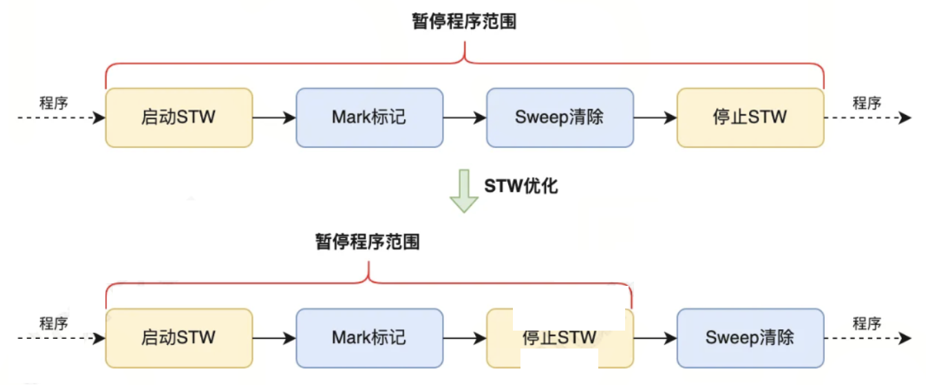 - 混合写屏障并不会让栈的扫描完全不需要STW,它的作用是通过在GC标记阶段灵活使用插入和删除写屏障,减少STW的次数 ,尤其是在堆的扫描上。在栈扫描时,GC仍然需要STW来暂停程序中的所有线程,确保栈的内容在扫描时保持一致。