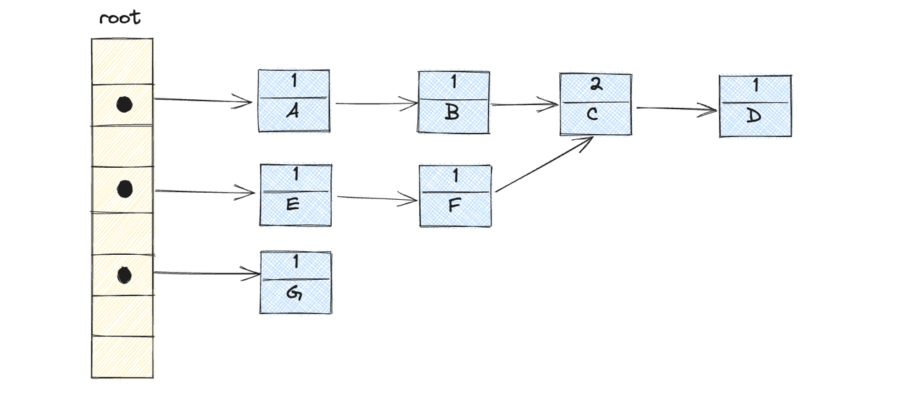 如上图所示,对象c中由于有两个对象B、F引用,所以计数为2,其余节点计数都是1