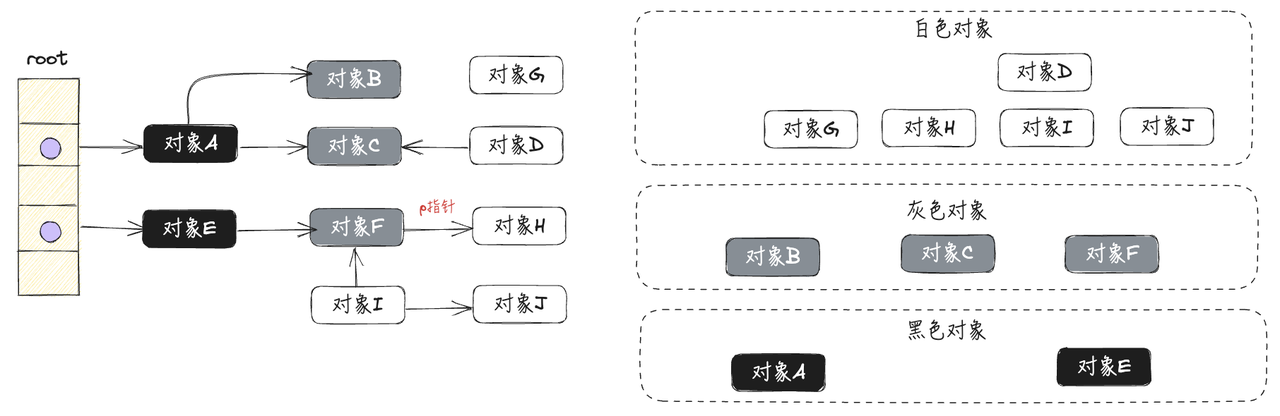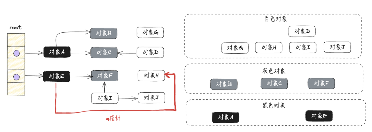 - 此时,对象E新增指针指向对象I,对象F删除对对象H的指针引用,触发混合写屏障,对象I标记为灰色,对象H标记为灰色