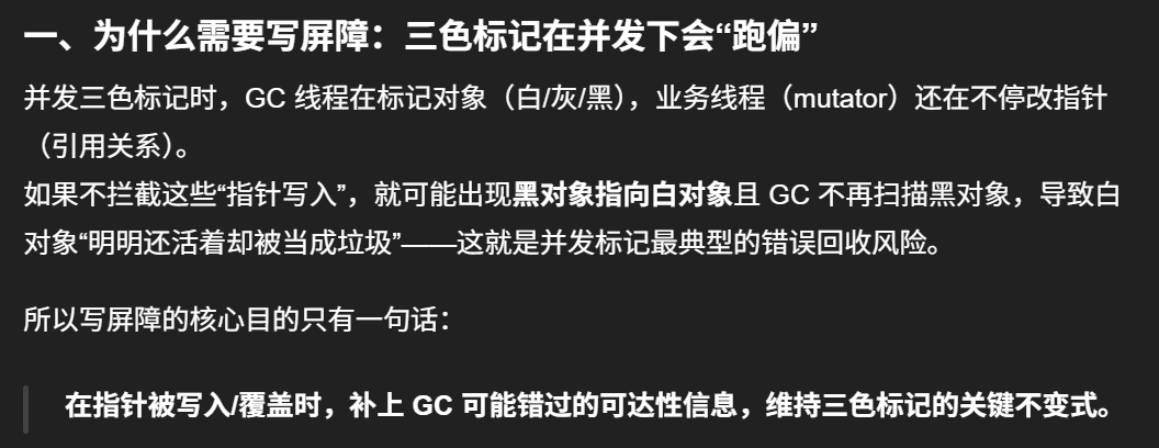 你玩了一会儿,想从你的 背包(栈) 里拿出那个小汽车......结果发现它已经没了!程序试图访问一块已经被回收的内存,于是直接崩溃。 问题根源: 这个方案的漏洞在于, "从灰色对象中删除引用"和"向栈上添加引用" 这两个动作都没有被监控到,导致一个本应存活的对象被错误地回收了。