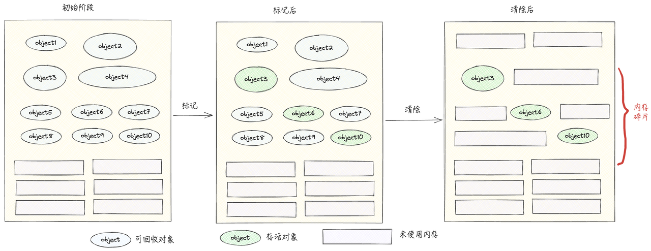 清除阶段: 遍历内存中所有对象,清除那些没有被标记的对象