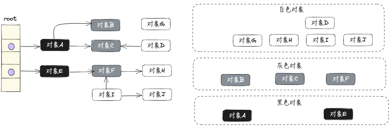 遍历灰色对象集合,将灰色对象标记为黑色,并将该对象指向的对象标记为灰色