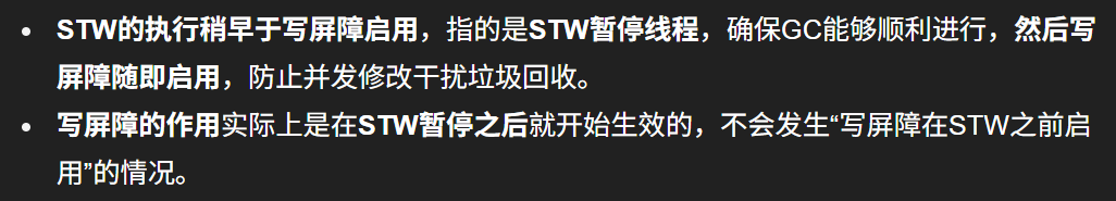 虽然历史版本中常常将写屏障与STW的开启和关闭时间点挂钩,但实际上,STW的执行稍早于写屏障启用,并且写屏障的作用在STW暂停后就已经开始执行。