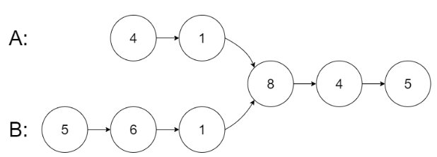 输入:intersectVal = 8,listA = [4,1,8,4,5],listB = [5,6,1,8,4,5],skipA = 2,skipB = 3