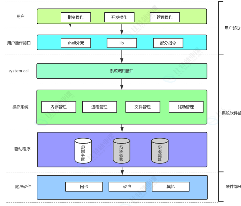 为此本质上来说操作系统就是一个搞管理的软件,向下管理硬件,向上提供系统调用函数。为此当用户进行开发操作时,需要用到如在屏幕上显示,或者从键盘上获取等等操作时,看似仅仅调用了函数操作。其实函数内部都封装了系统调用接口,系统经过识别所需要的哪一种硬件进行控制。