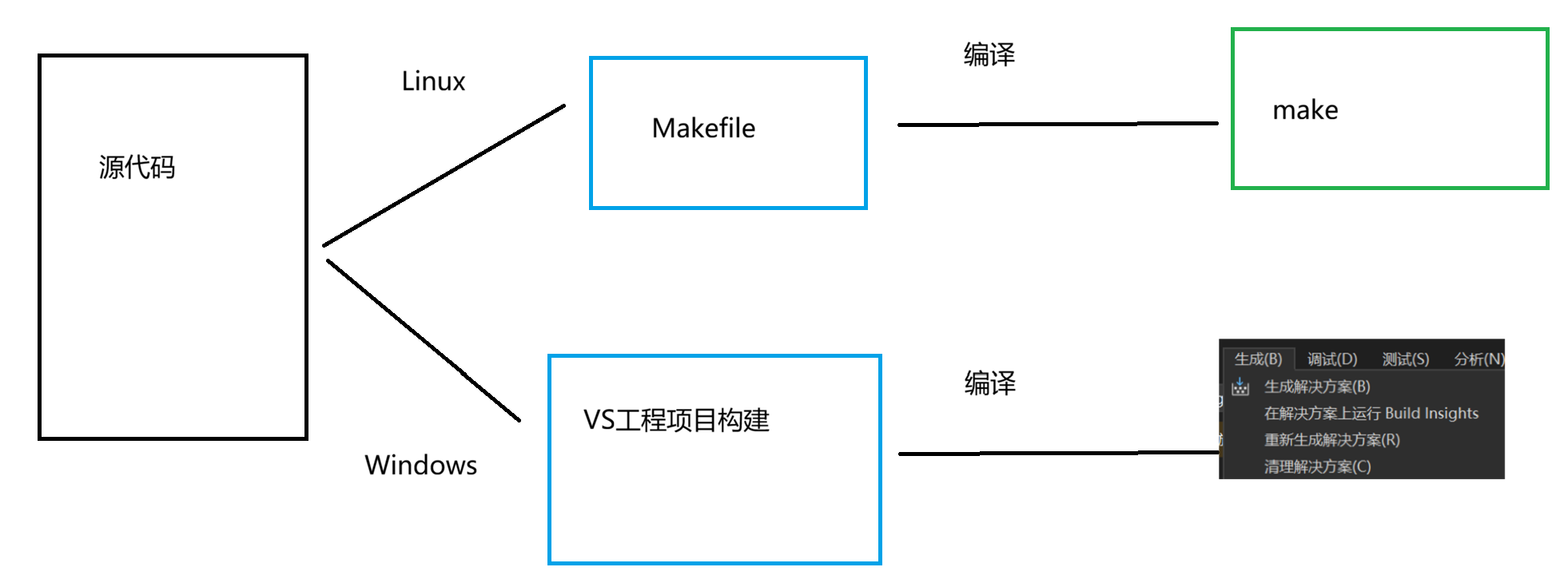 | 跨平台支持 | 需要手动适配不同平台(Linux/macOS/Windows) | 自动生成对应平台的构建文件(Makefile/VS Project/Xcode等) | 一次编写,多处构建,显著提高跨平台开发效率 |
