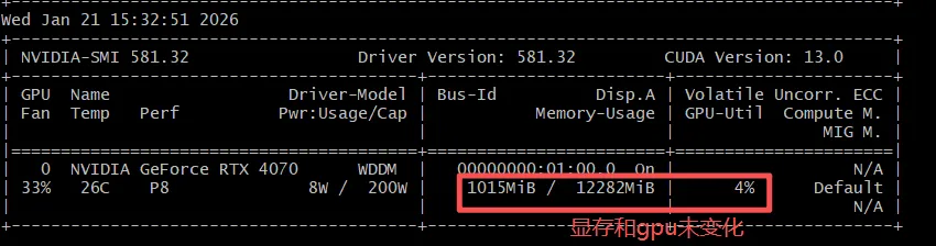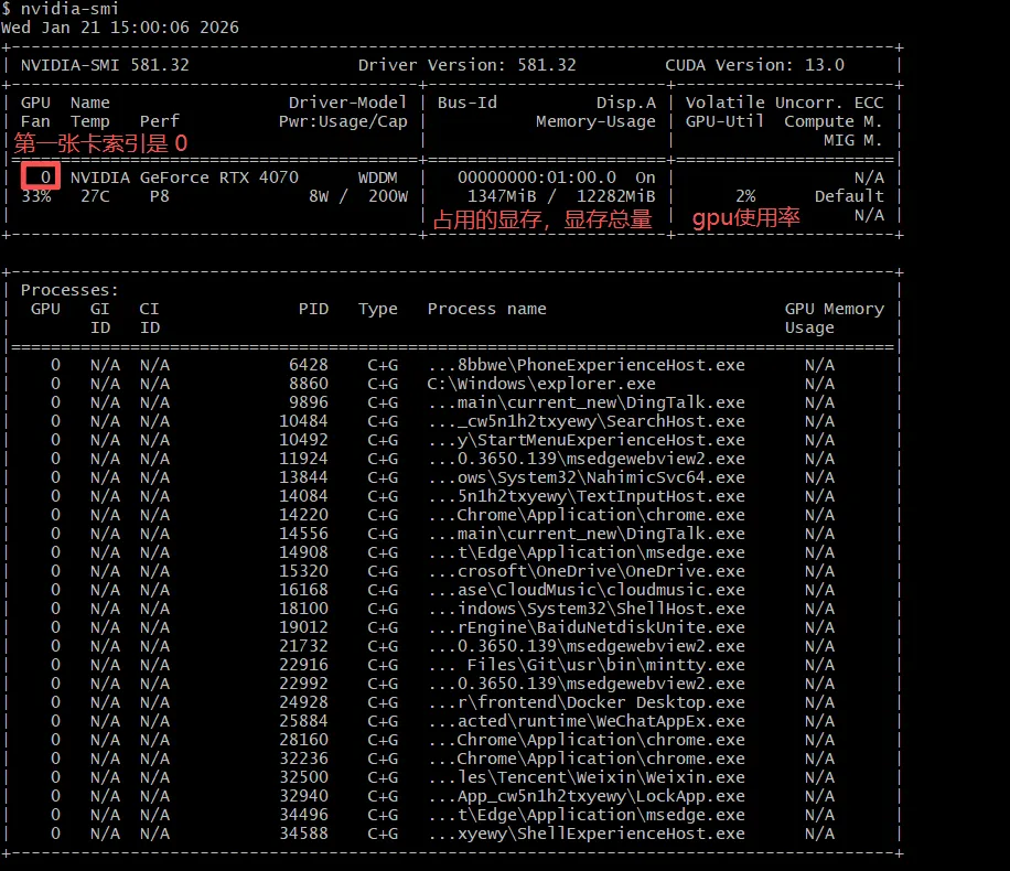 - 0 表示nvidia 4070是第一张显卡, 索引的概念,下面的进程关联了这块显卡0