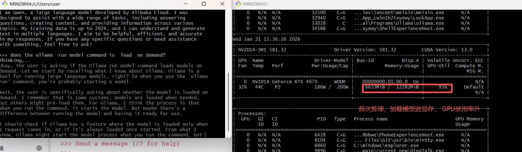 首次推理请求, 显存使用稳定在6g, gpu使用率上升,推理结束,显存使用率不会降, gpu使用率回落, 说明ollama是按需加载大模型。