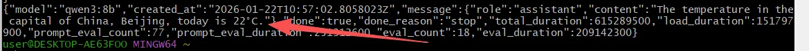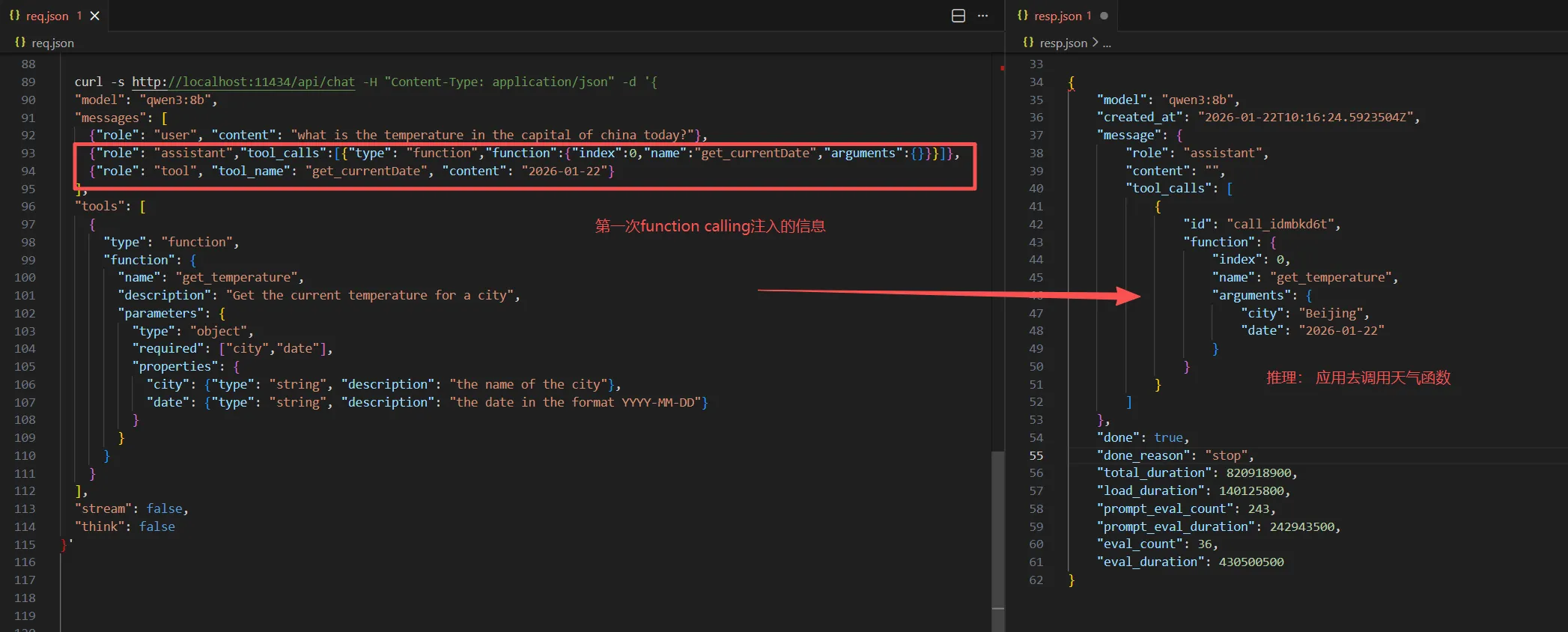 LLM推理提示应用去调用get_temperature函数,此时参数都已经就绪了:beijing是推理已知,2026-01-22是外部调用注入信息。