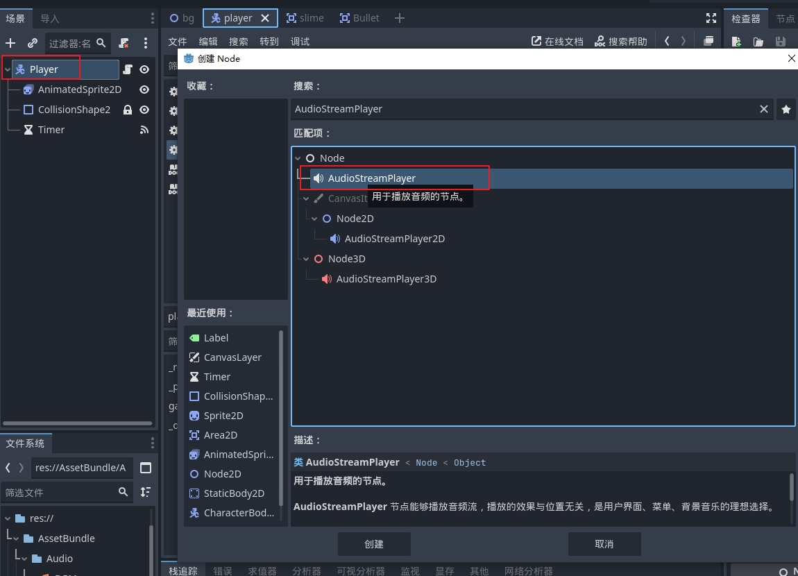 - 我们给玩家发射子弹的时候自动播放子弹音效,在godot中播放声音也是通过节点进行完成的,所以就是在玩家场景中添加AudioStreamPlayer节点