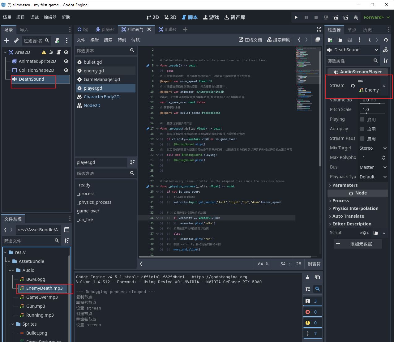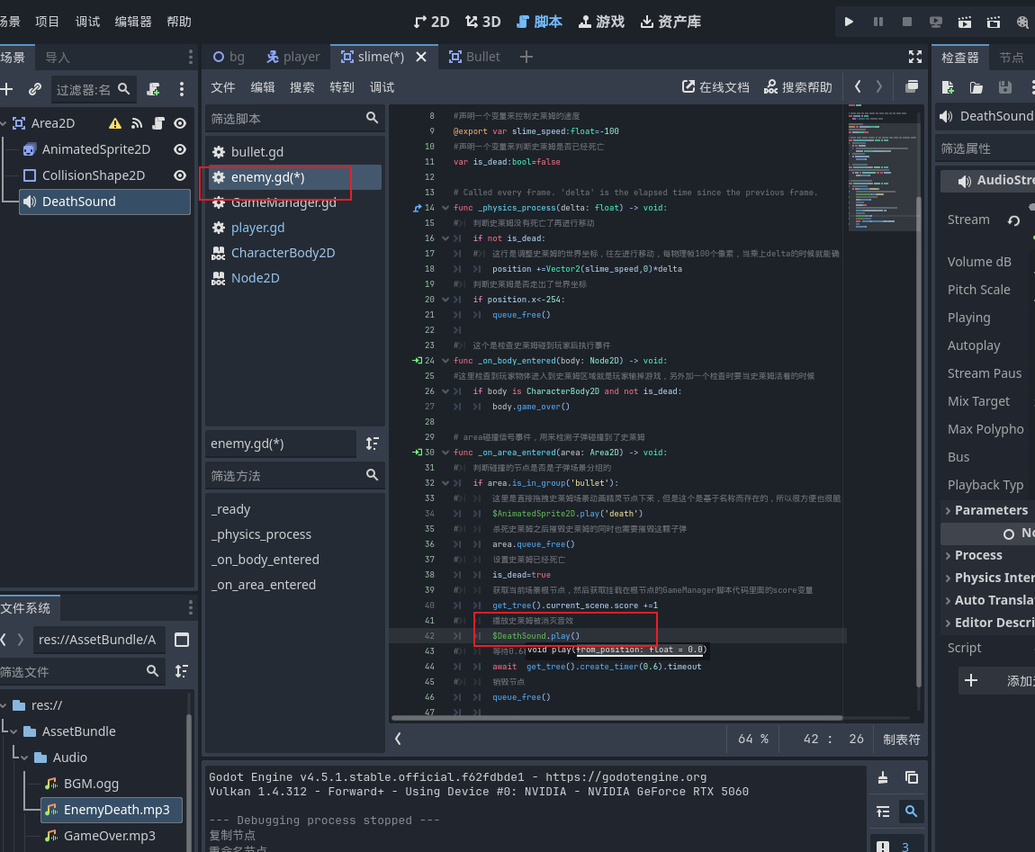 接着为史莱姆添加死亡音效:在史莱姆场景中加入音频节点并在子弹命中回调中播放。同时修复逻辑问题,增加史莱姆存活状态判断,避免史莱姆死亡后仍与玩家碰撞导致游戏失败。