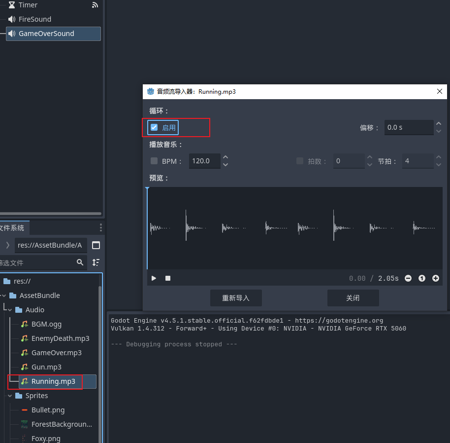AudioStreamPlayer 节点,实现子弹发射音效与游戏失败音效,并在对应的发射子弹函数与 game_over 函数中触发播放。随后为玩家跑步添加循环音效,通过在音频资源中启用循环并重新导入,在脚本中根据玩家移动状态控制播放与停止,确保仅在移动且游戏未结束时播放。 -