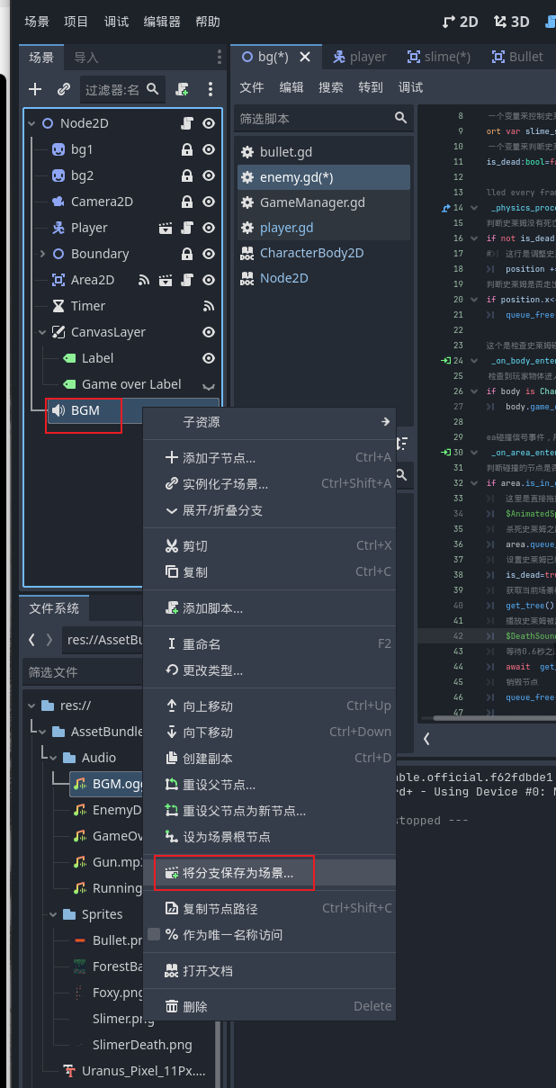 - 我们右键BGM节点,然后选择将分支节点保存为场景,然后保存到Scense文件夹中