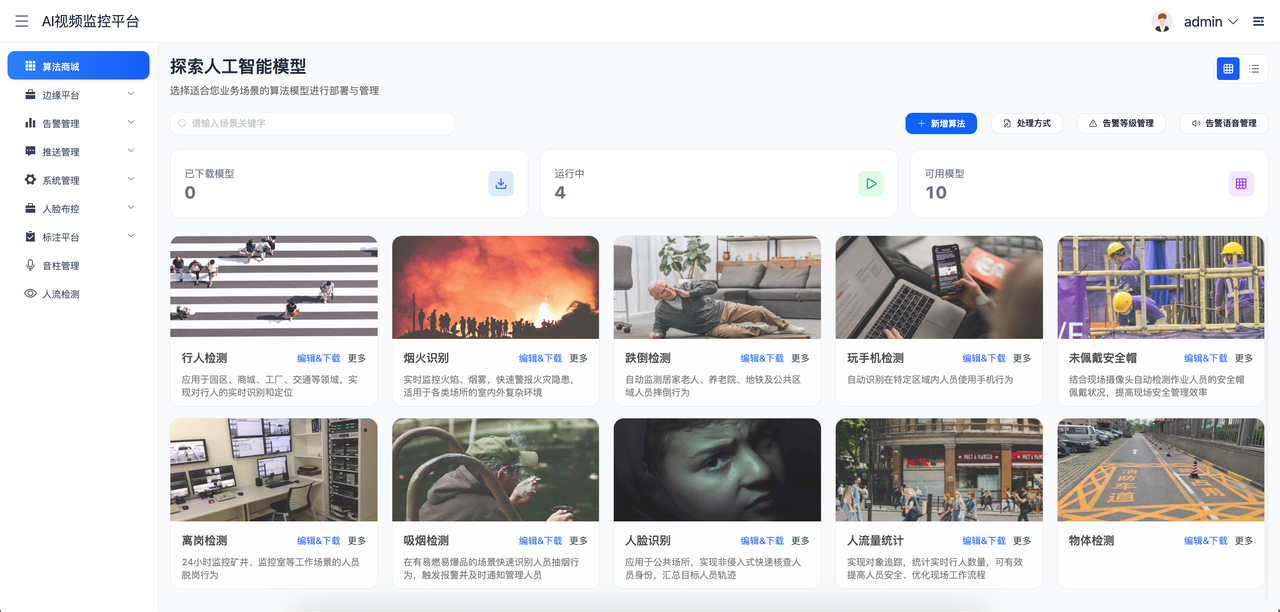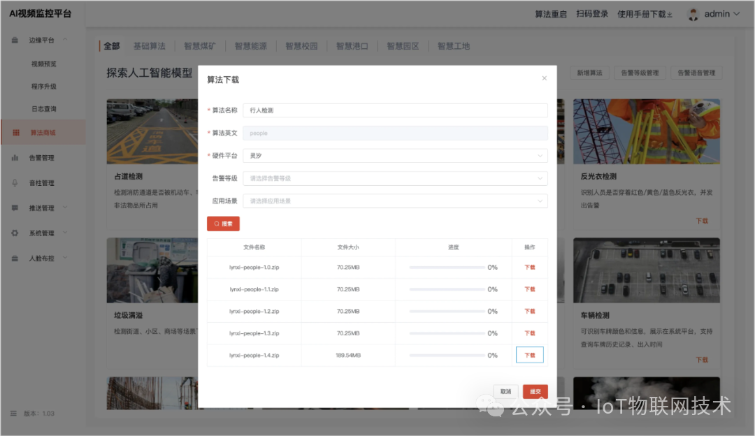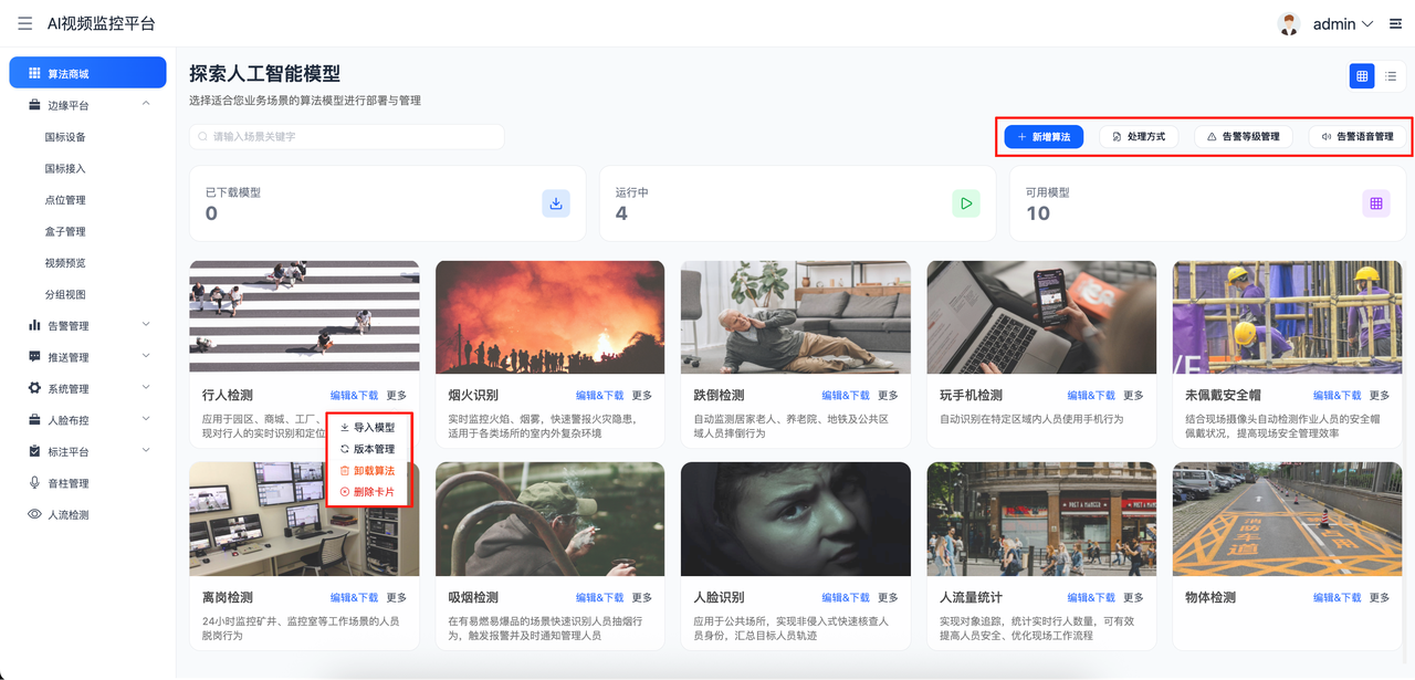 - AI算法商城提供丰富的算法模型,支持手动新增算法、对已有算法新增新增模型文件,平台内语音告警的设置。同一算法的版本升级与降级的操作。