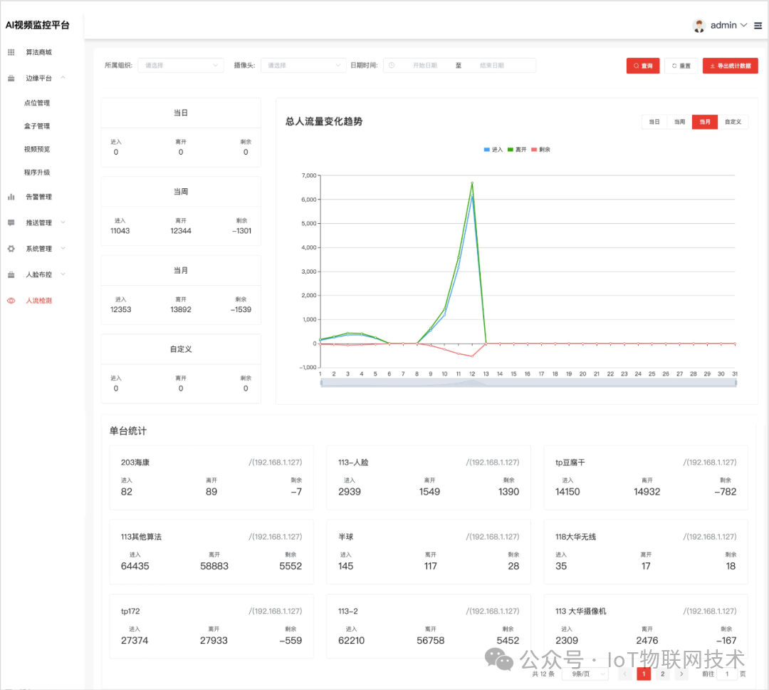 单台统计:细分每台摄像机的统计数值,并根据搜索的时间日期范围进行变化展示。