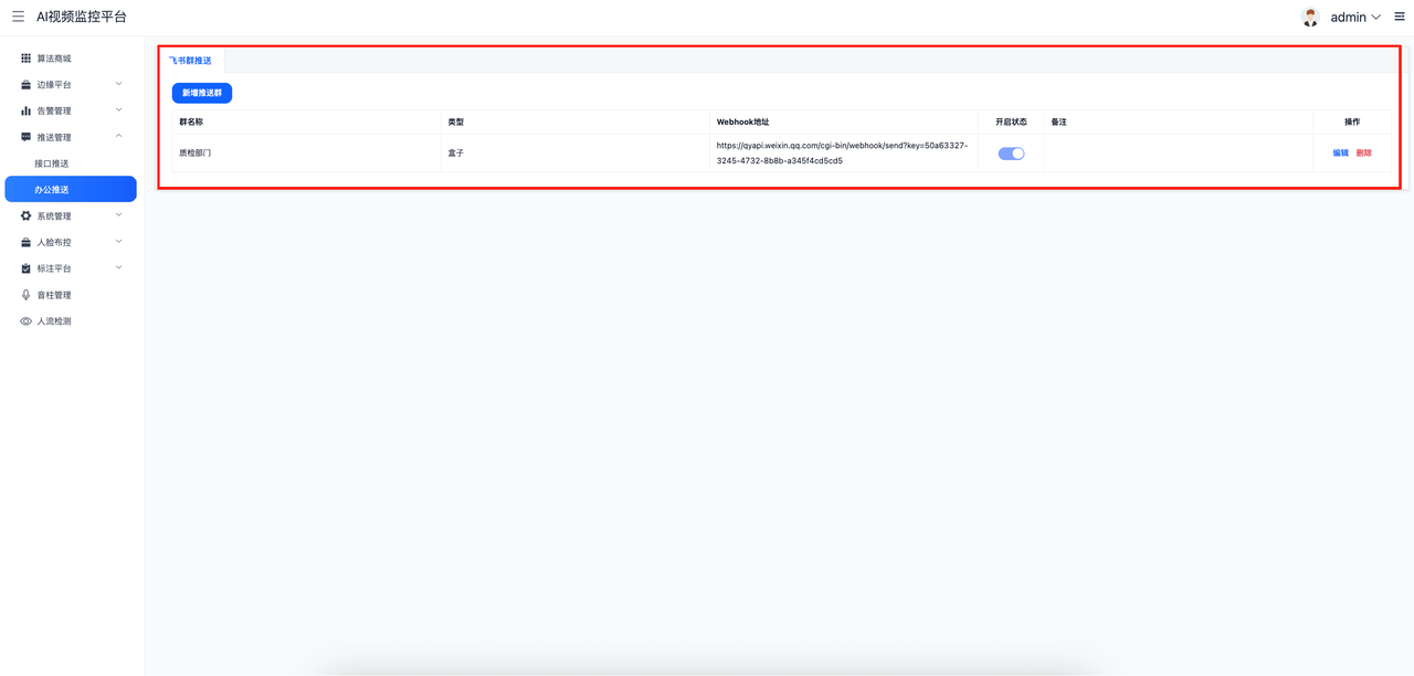 AI视频监控平台告警事件推送管理支持API接口推送、飞书推送。