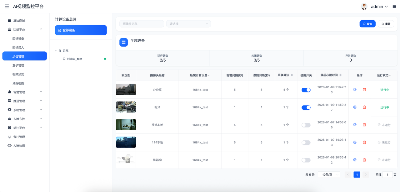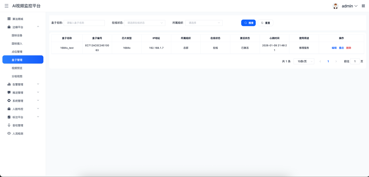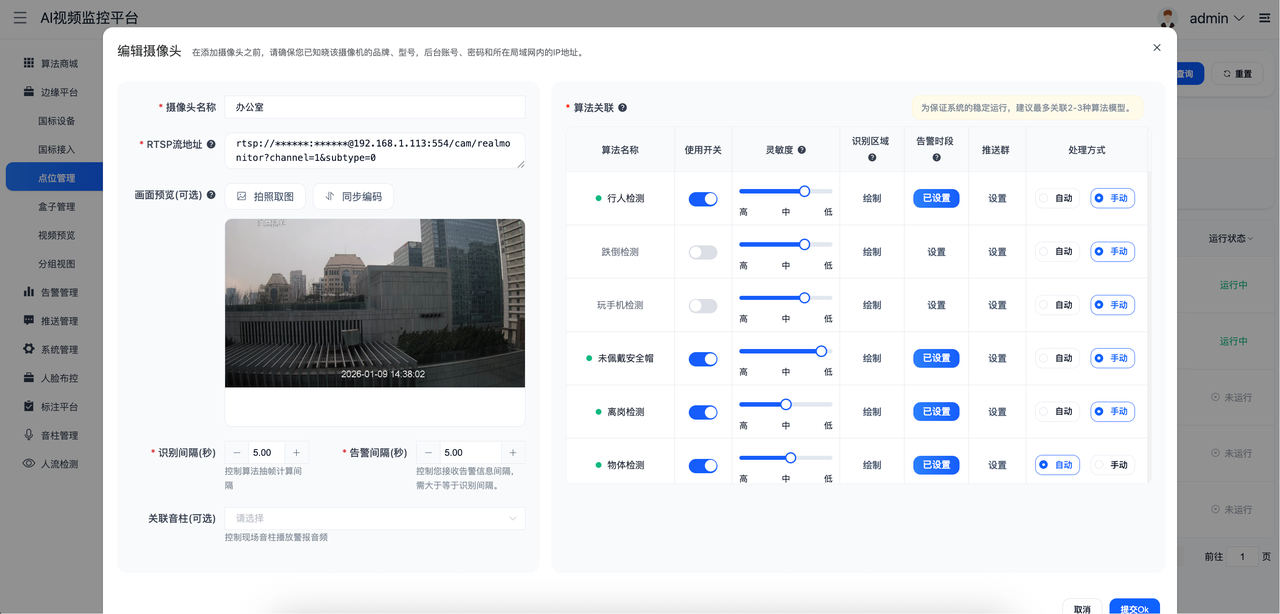 - 管理边缘盒子下的摄像机,控制实际运行算法,控制识别告警间隔,对具体算法的运行参数配置,实时视频流查看、算法程序版本管理、日志的相关操作。