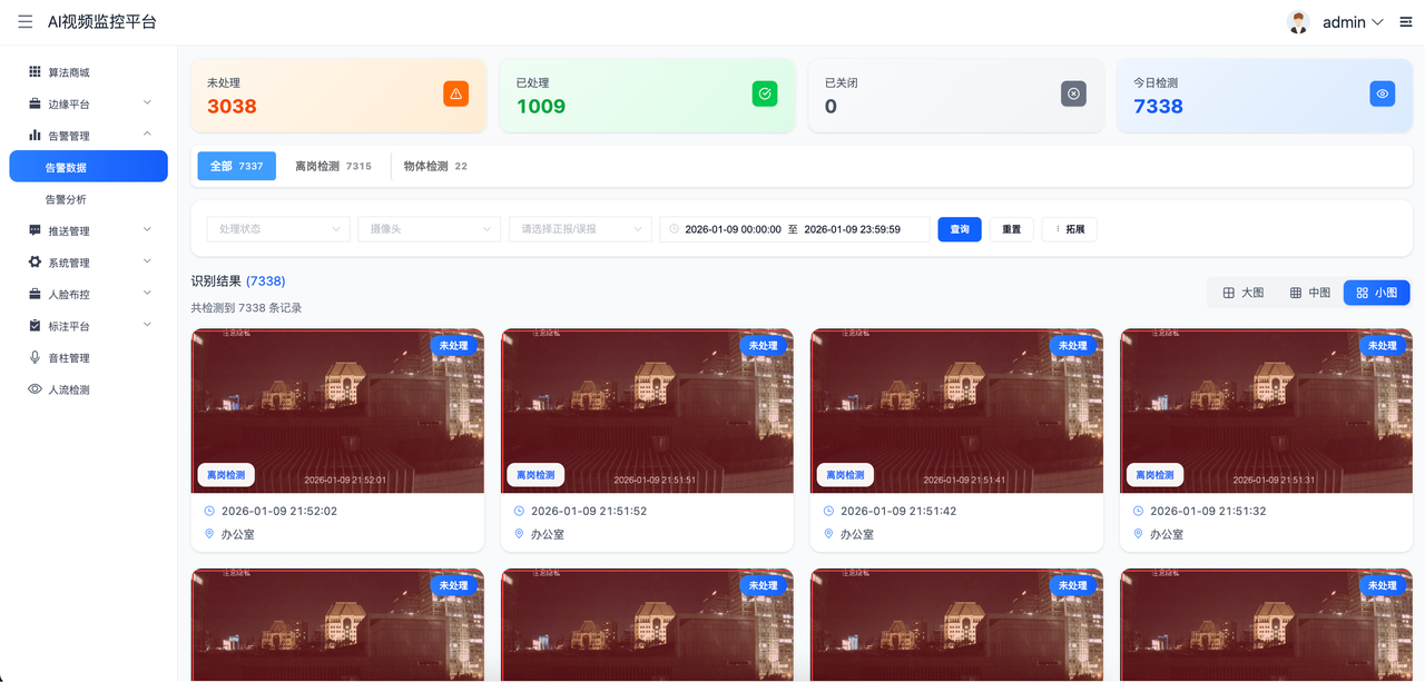 - 告警管理即将平台内计算后的告警数据汇总于此。可根据时间、摄像头、算法进行筛选展示,支持查看原图。可根据实际存储需求调整保存时长。支持导出告警原图