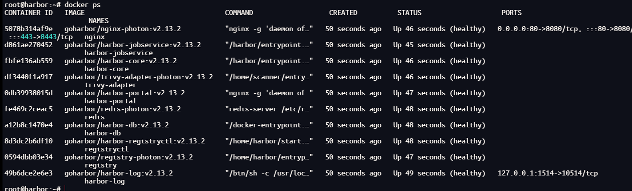 此时去harbor服务器,查看服务状态,可以看到所有服务已正常启动。