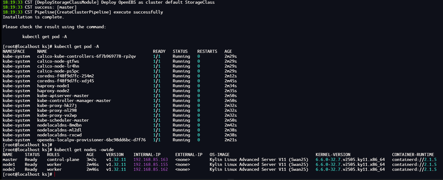 本文以麒麟V11,使用k8s 1.32.11+ks4.1.3core离线部署1master2node节点。