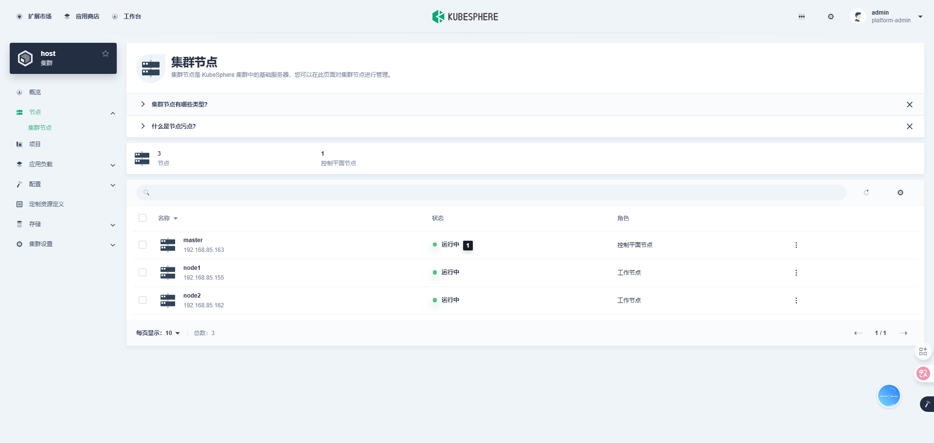 | node1 | x86_64 | 麒麟V11 | 2核4G | 192.168.85.155 |