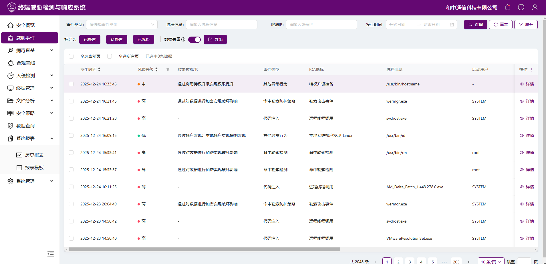 新一代EDR深度集成于Windows操作系统内核层面,突破了传统产品"表层检测"的瓶颈。通过内核级数据采集引擎,它能够全面捕获系统全量事件------包括进程创建、线程注入、注册表修改、网络连接、内存操作等核心行为数据,实现从文件到内存、从静态到动态的全方位监测覆盖。在此基础上,EDR结合MITRE ATT&CK框架构建贴合企业实际的行为基线,将正常业务操作与异常攻击行为精准区分,让任何偏离基线的可疑行为都无法"隐身"。