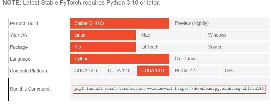 - NVIDIA DGX Spark内置了CUDA 13.0。目前Pytorch官方提供最新,针对CUDA 13.0的Pytorch选择如下(安装会失败):
