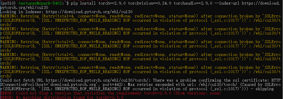 Could not fetch URL https://download.pytorch.org/whl/cu130/torch/: There was a problem confirming the ssl certificate: HTTPSConnectionPool(host='download.pytorch.org', port=443): Max retries exceeded with url: /whl/cu130/torch/ (Caused by SSLError(SSLEOFError(8, '[SSL: UNEXPECTED_EOF_WHILE_READING] EOF occurred in violation of protocol (_ssl.c:1017)'))) - skipping