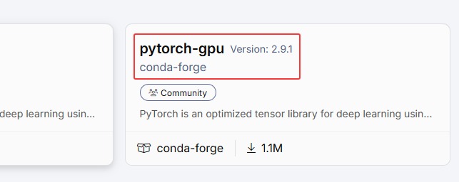 - 正确安装:首先通过Pytorch的 Previous PyTorch Versions查询CUDA 13.0版本的Pytorch。然后通过anaconda官方 网站查询相关资源,如下图,查得torch=2.9.1版本: