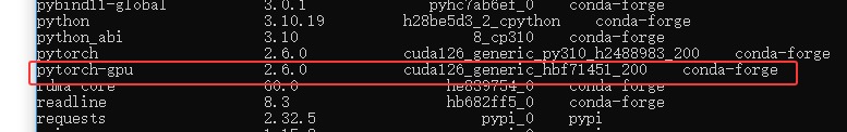 - 安装成功后通过conda list查询,选择pytorch-gpu 2.9.1版本,实际安装的是2.6.0版本,如下图: