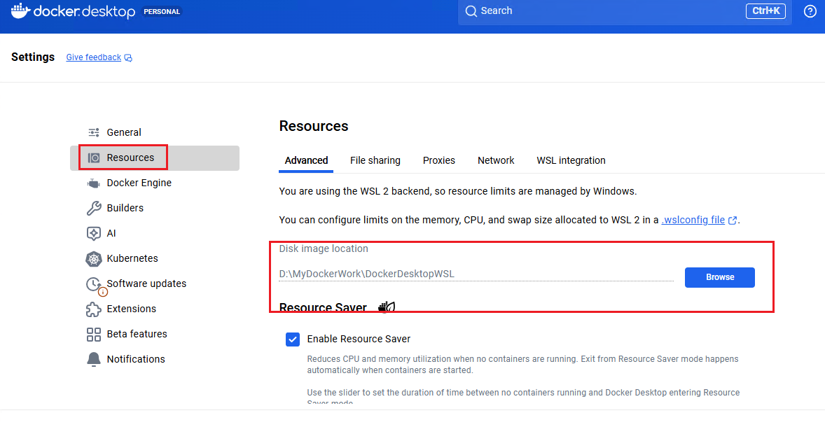 随着Docker-Desktop版本的升级,以4.48.0版本为例,使用wsl -l -v命令你会发现docker-deskto-data这项WSL发行版实例没有了。原因是Docker-Desktop对其进行了升级,可以通过设置项 → Resources → Advanced选择Disk Image location(磁盘镜像位置),此配置会决定数据存储位置。