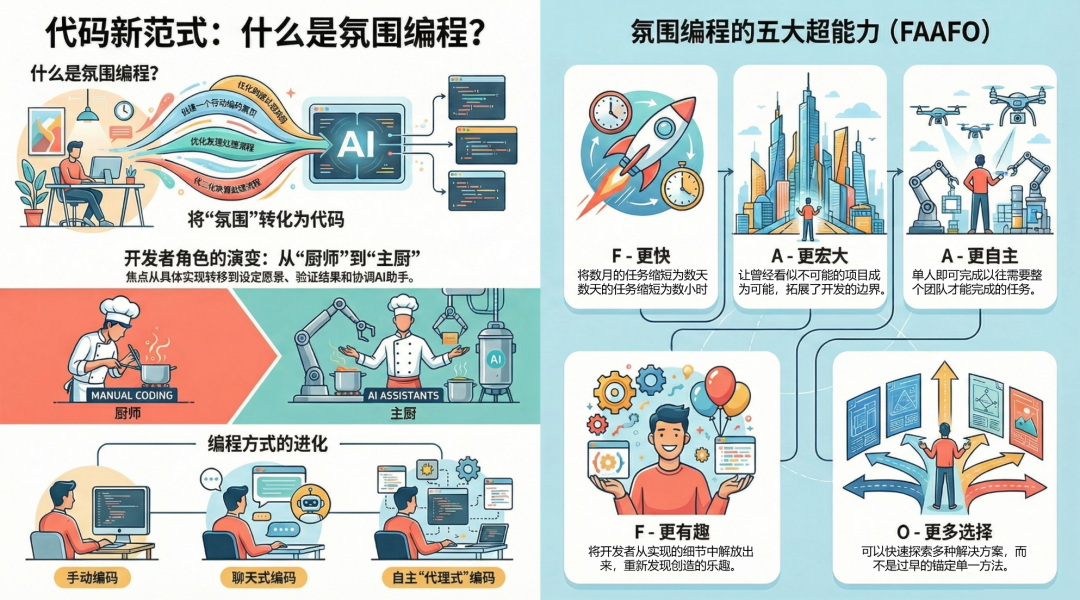 概念萌芽(2024-2025): 最早由 **Andrej Karpathy 提出。他描述了一种"放弃对代码细节的执着,完全投入到与AI对话的'氛围'中"的新开发模式。
