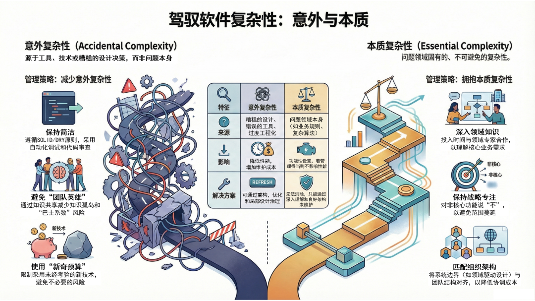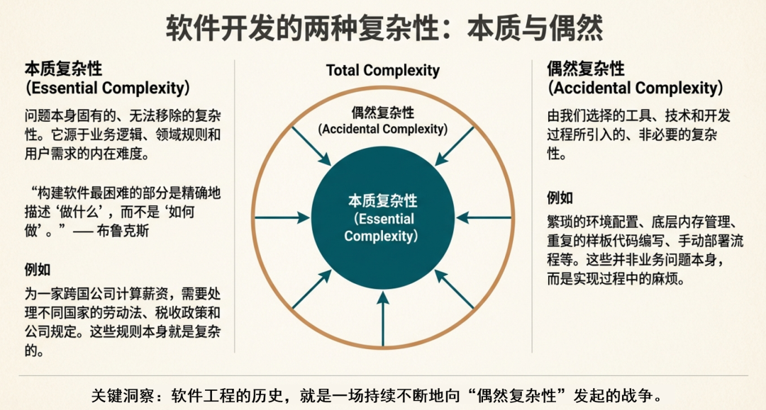 偶然复杂性 (Accidental Complexity):由工具、流程、语言或沟通障碍引发的麻烦(如繁琐的配置、不一致的 API、环境搭建)。